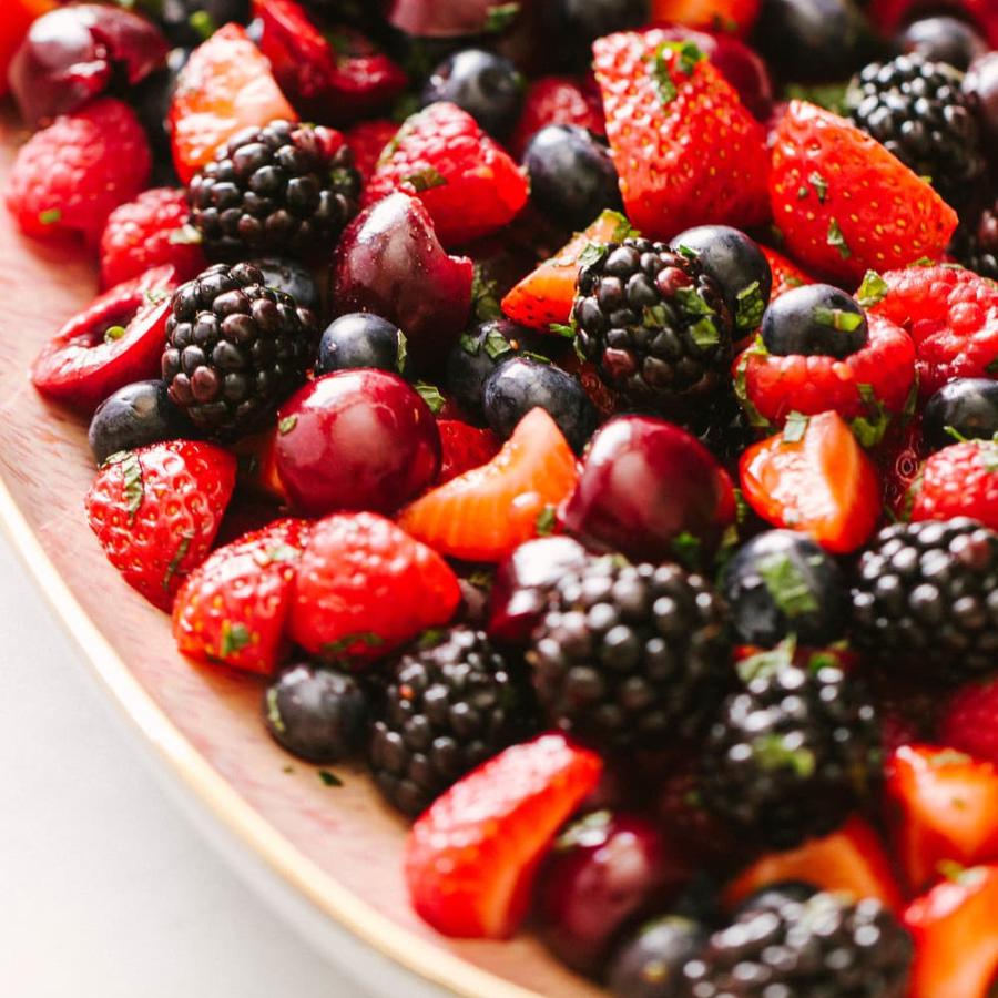 Dùng một cái bát, trộn các loại quả mọng với quả anh đào và các thành phần nguyên liệu khác, trộn đều, chia ra các bát nhỏ hơn, có thể để lạnh trước khi dùng