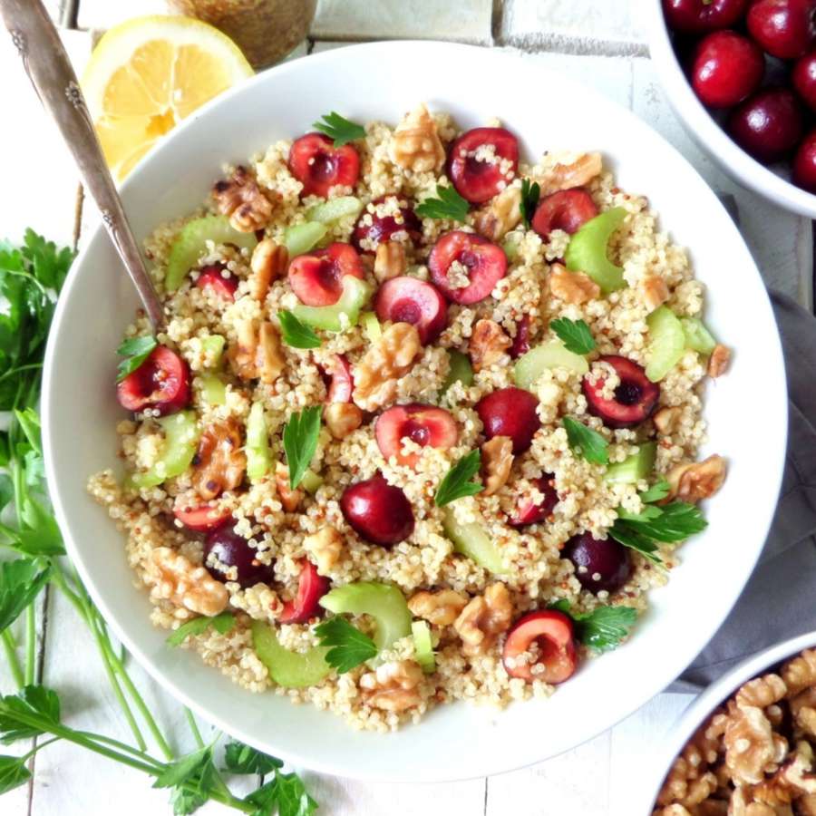 Dùng một cái bát, trộn quả anh đào với cơm súp lơ và các thành phần nguyên liệu khác, trộn đều và thưởng thức
