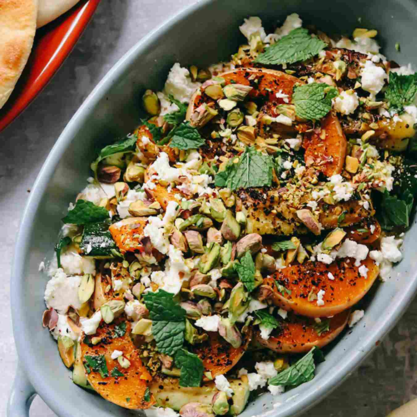 Dùng một cái bát salad khác, trộn bí nghệ với củ cải, bí xanh và lá bạc hà