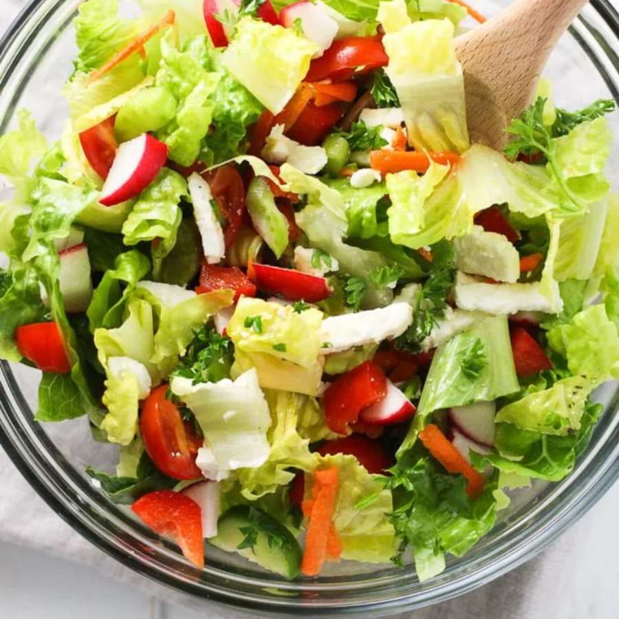 Dùng một cái bát, trộn rau xà lách với hạt óc chó, hành lá và các thành phần nguyên liệu khác, trộn đều và thưởng thức