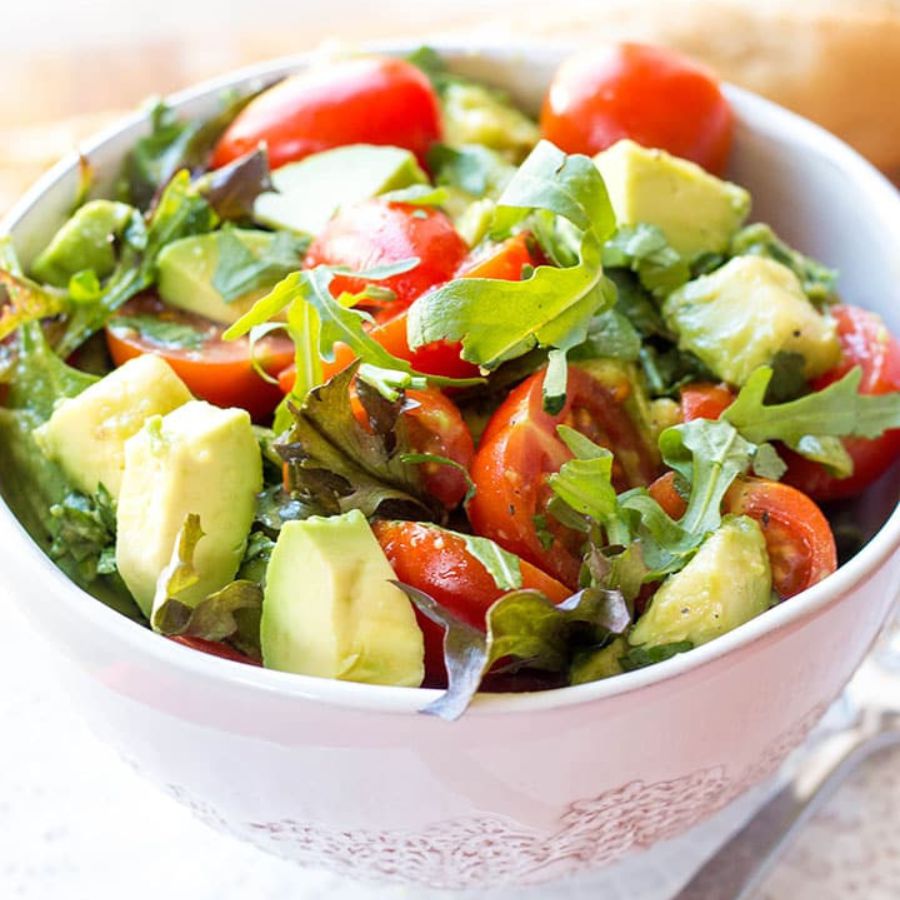 Dùng một chiếc bát salad, trộn cà chua với bơ, rau chân vịt và các nguyên liệu khác, trộn đều, chia vào các bát nhỏ và thưởng thức