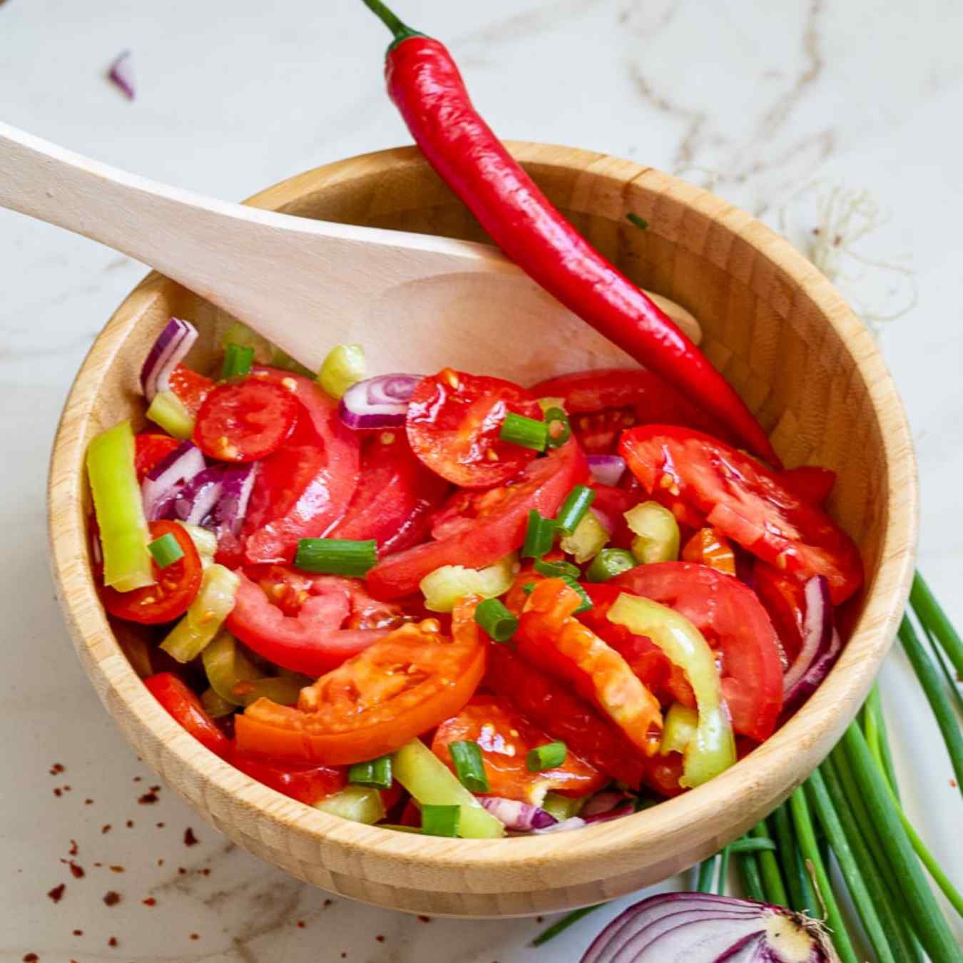 Dùng một bát salad, trộn cà chua với ớt và các thành phần nguyên liệu khác với nhau, trộn đều và thưởng thức cho bữa sáng