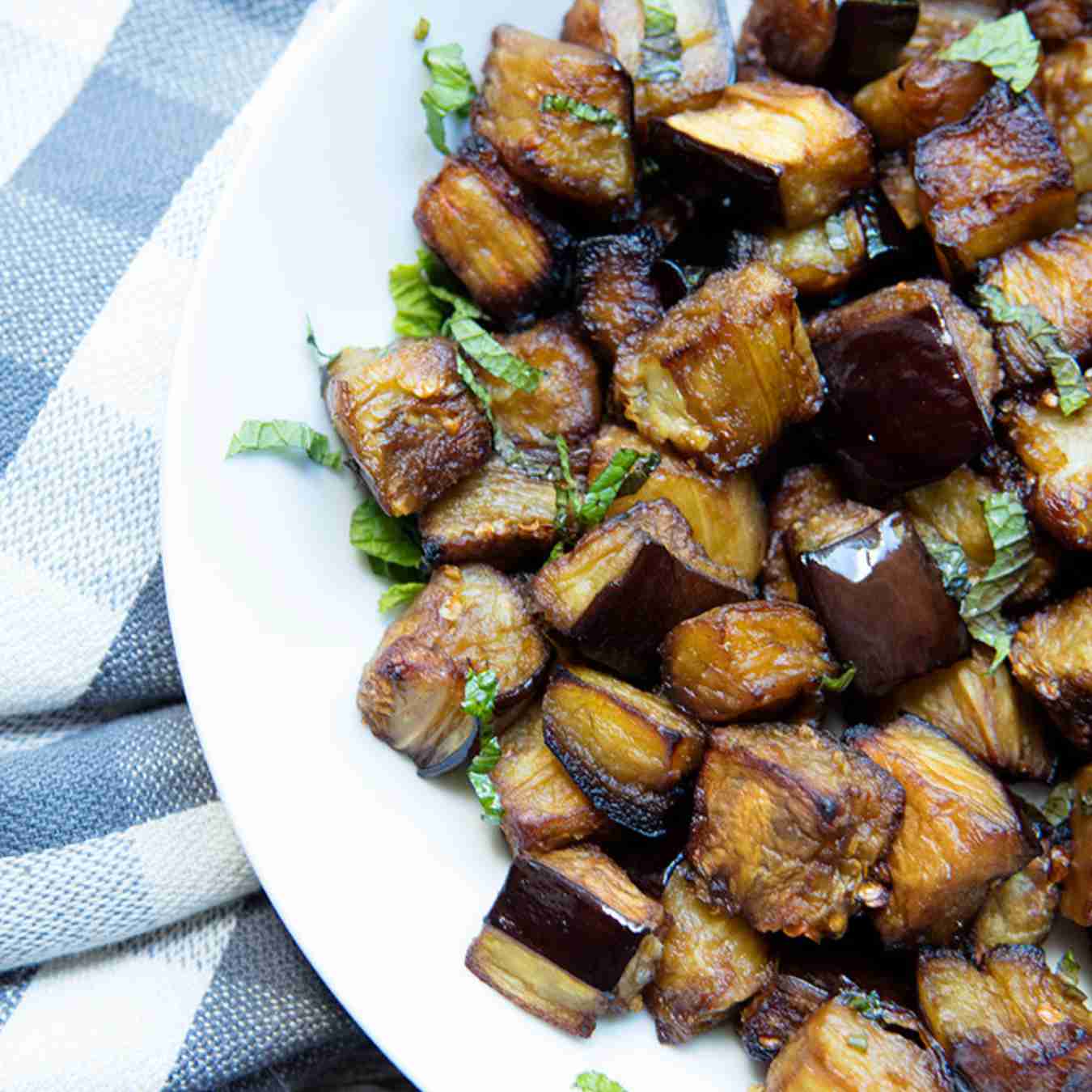 Dùng nĩa xiên cà tím, xếp lên khay nướng, cho vào lò nướng ở nhiệt độ 175ºC (350ºF) và nướng trong 1 giờ 30 phút