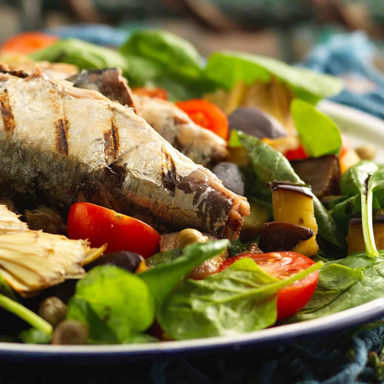 Trộn cá mòi, cà tím nướng và Atisô, rau chân vịt, nụ bạch hoa, cà chua, giấm cùng với phần dầu còn lại trong một cái bát trộn