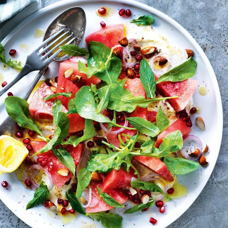 Dùng một cái bát, trộn dưa hấu với hạt lựu, cải xoăn và các nguyên liệu khác, trộn đều, chia ra đĩa và thưởng thức
