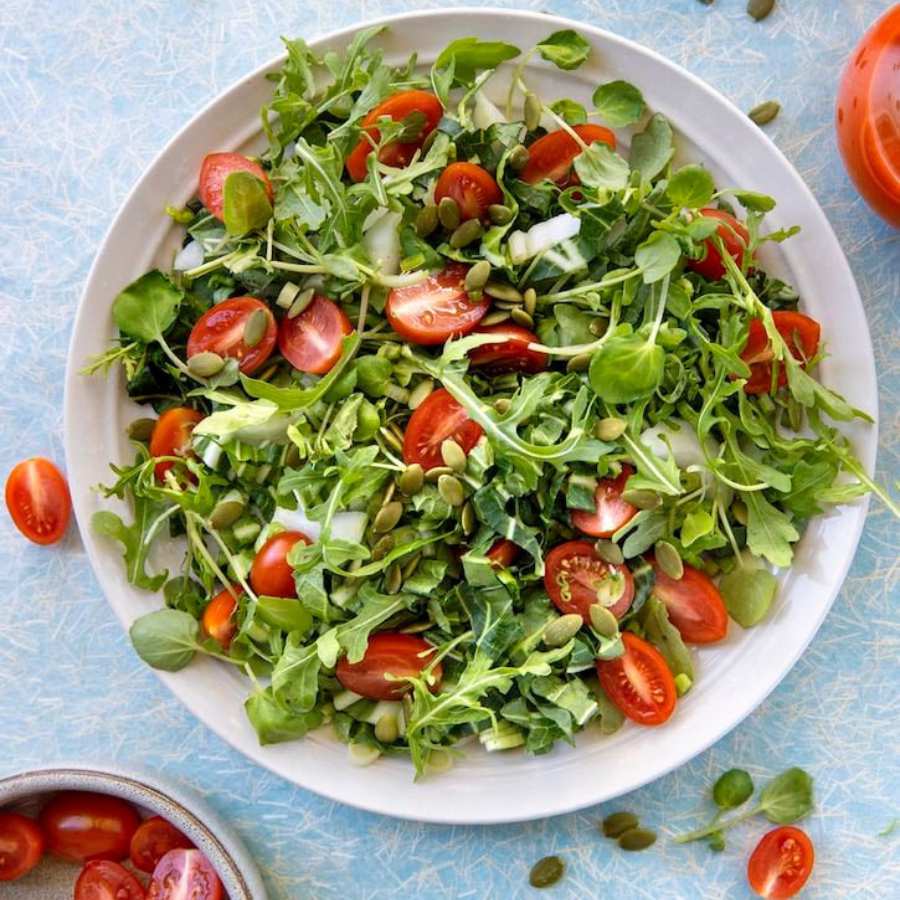 Dùng một cái bát, trộn cải xoong với nho và các thành phần nguyên liệu khác, trộn đều, chia vào các bát nhỏ hơn và thưởng thức