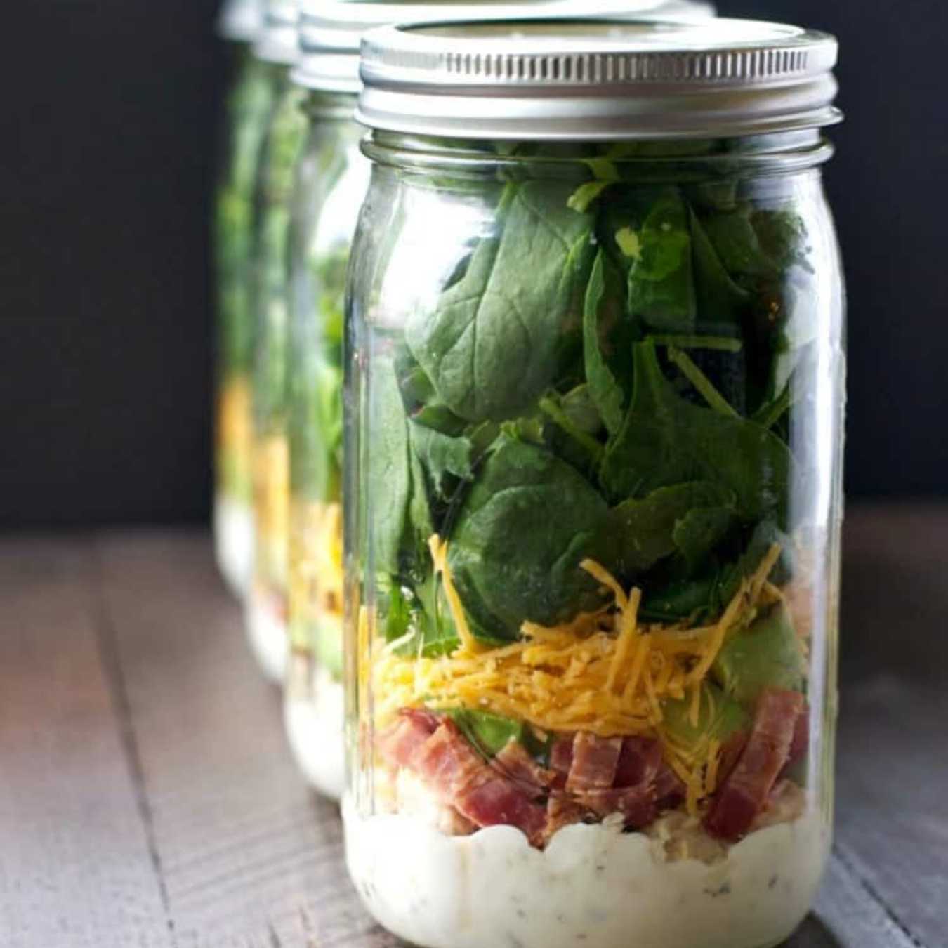 Để làm món salad, hãy cho thêm một lớp cần tây vào mỗi lọ, tiếp theo là một lớp trứng đã đánh nhuyễn, tiếp sau đó là các miếng thịt heo xông khói và rau trộn