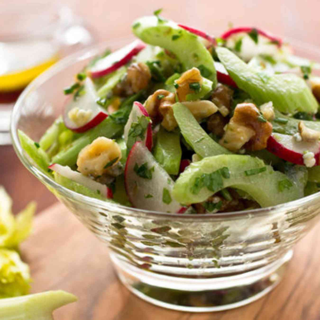Thái cần tây thật mỏng và cho vào bát salad. Cắt nhỏ củ cải sau đó thêm cùng với mùi tây vào bát salad