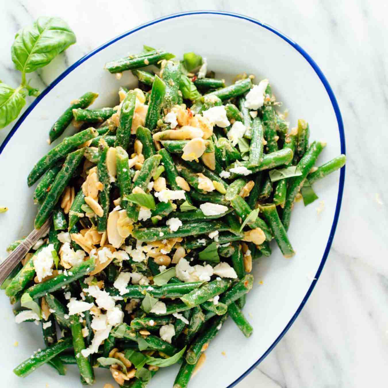 Để đậu xanh ráo nước rồi cho vào bát salad. Thêm quả óc chó, thì là và phô mai dê rồi trộn nhẹ nhàng
