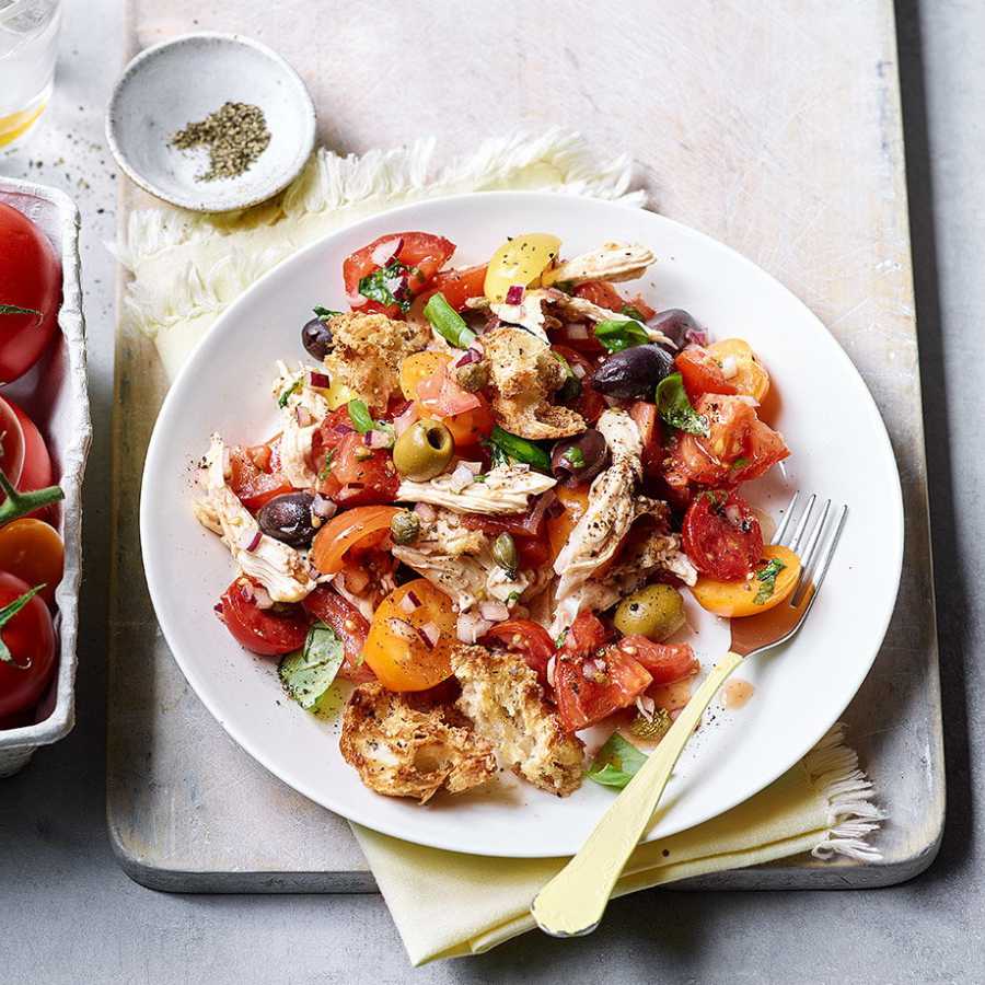 Trộn thịt gà với bơ, thịt heo xông khói, muối, cà chua và hạt tiêu trong một bát trộn