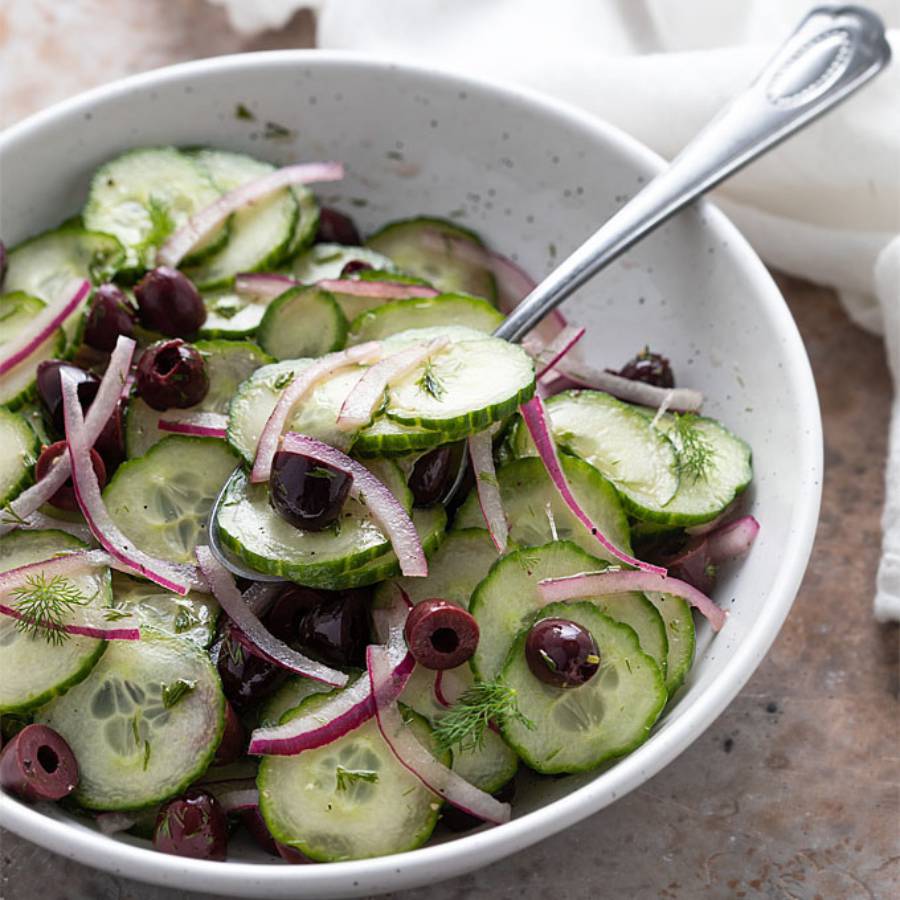 Dùng một cái bát, trộn dưa chuột với ôliu, hành tím và các thành phần nguyên liệu khác, trộn đều, chia ra các đĩa và thưởng thức