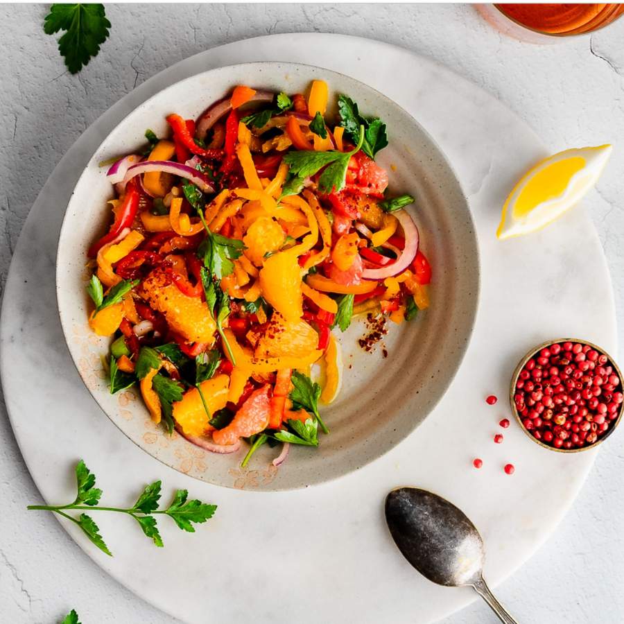 Dùng một cái bát, trộn ớt chuông với nước sốt nghệ, trộn đều và thưởng thức