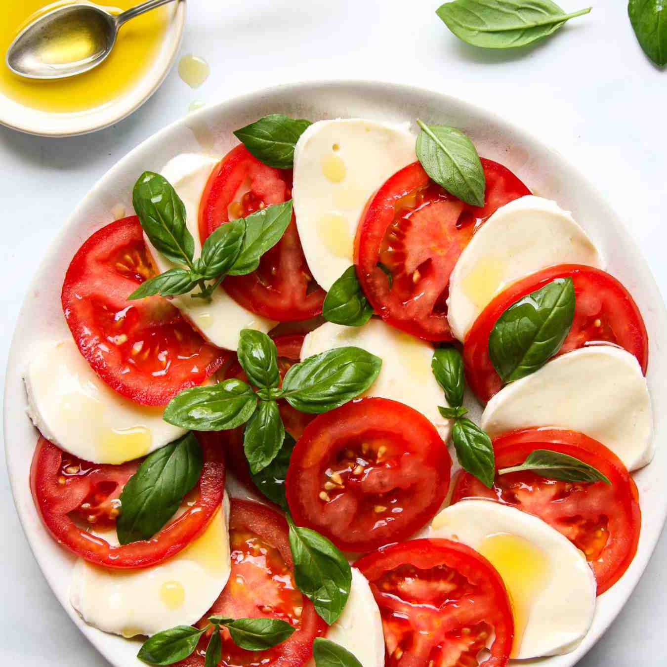 Xếp xen kẽ các lát cà chua và phô mai Mozzarella trên 2 đĩa
