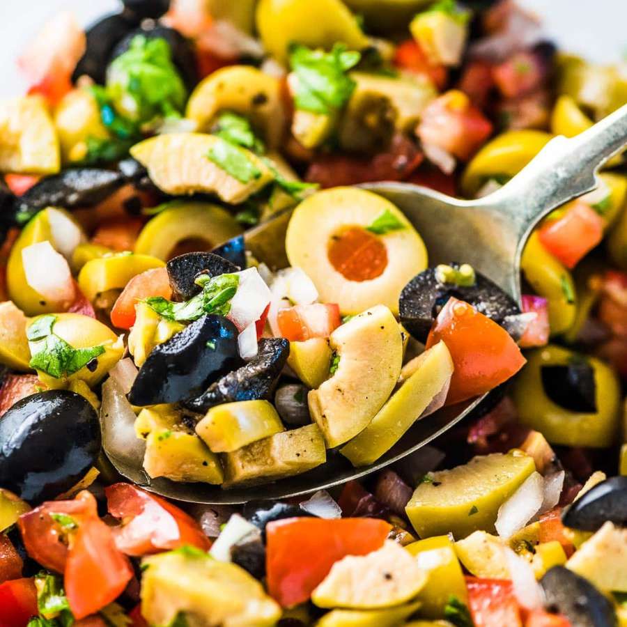 Dùng một cái bát, trộn ôliu với tỏi tây và các nguyên liệu khác, trộn đều, chia vào các bát nhỏ và dùng thay món khai vị