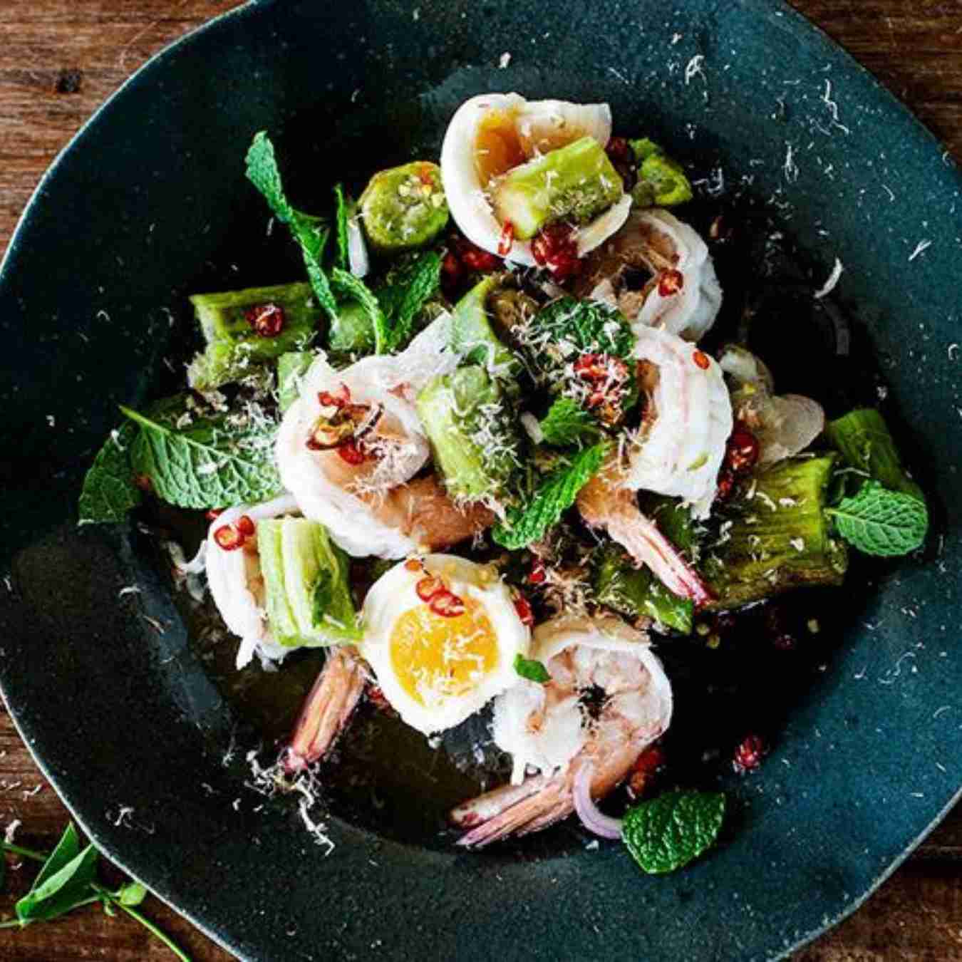 Đổ tôm vào hỗn hợp, nấu trong 2 phút mỗi mặt rồi chuyển sang một cái bát sạch