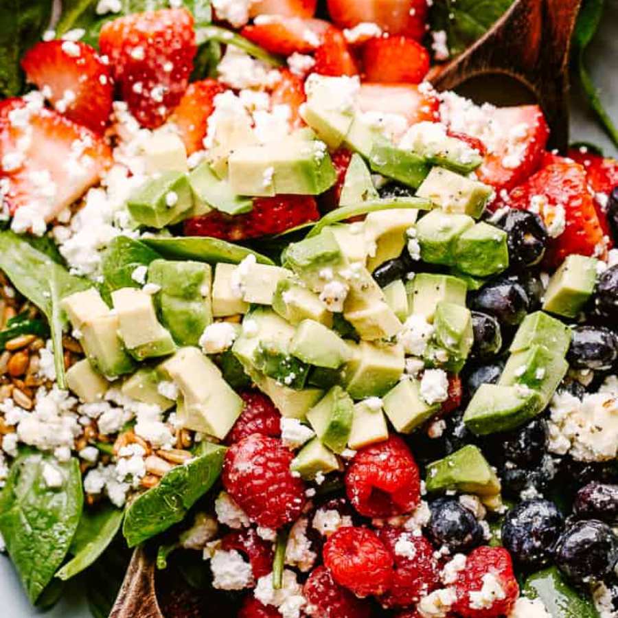 Dùng một cái bát, trộn các loại quả mọng với trái bơ và các thành phần nguyên liệu khác, trộn đều, chia vào các bát nhỏ hơn, để lạnh trước khi ăn