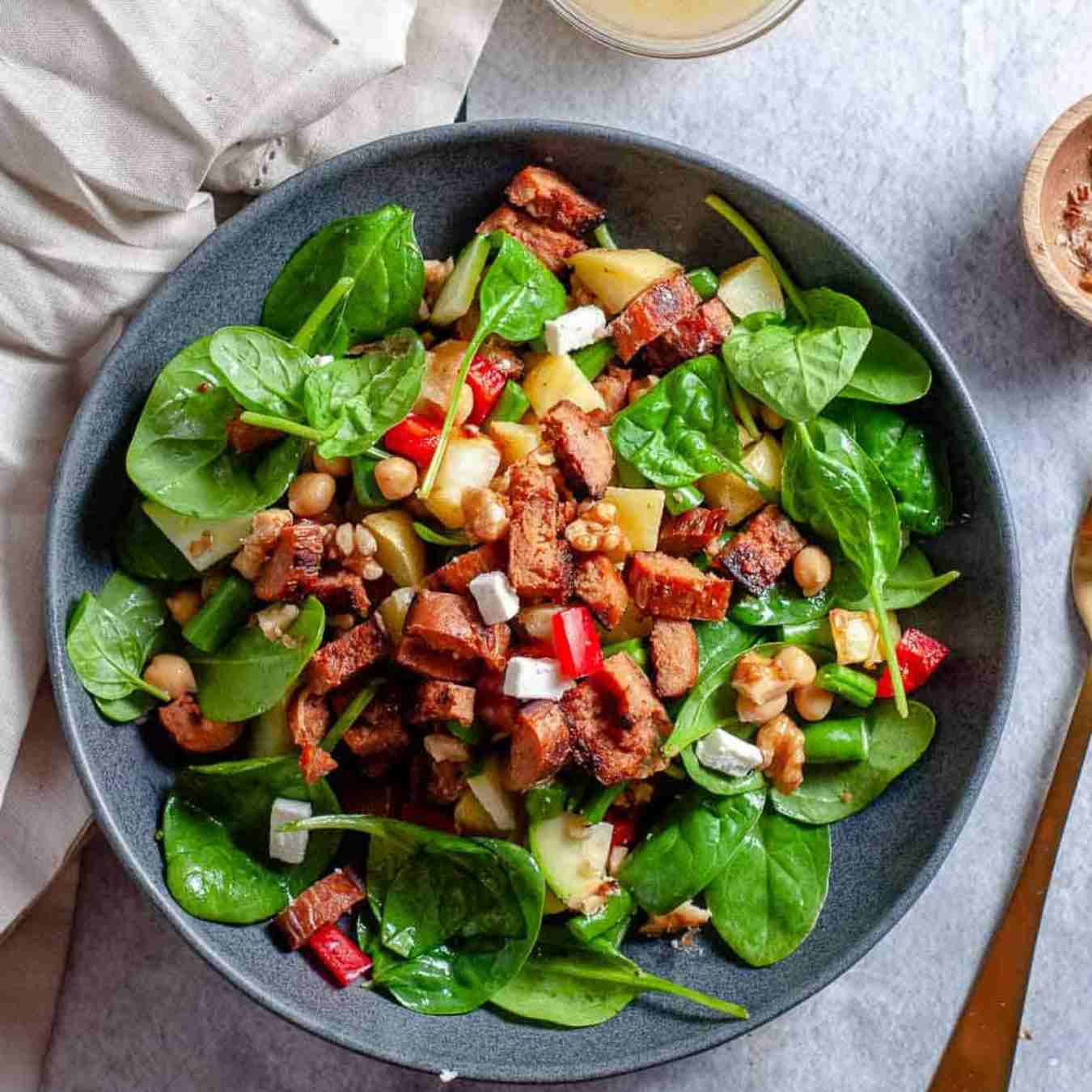 Dùng một bát salad, trộn rau chân vịt với phô mai Mozzarella, cà chua, muối, tiêu, nước cốt chanh và sốt pesto, rồi trộn đều lên