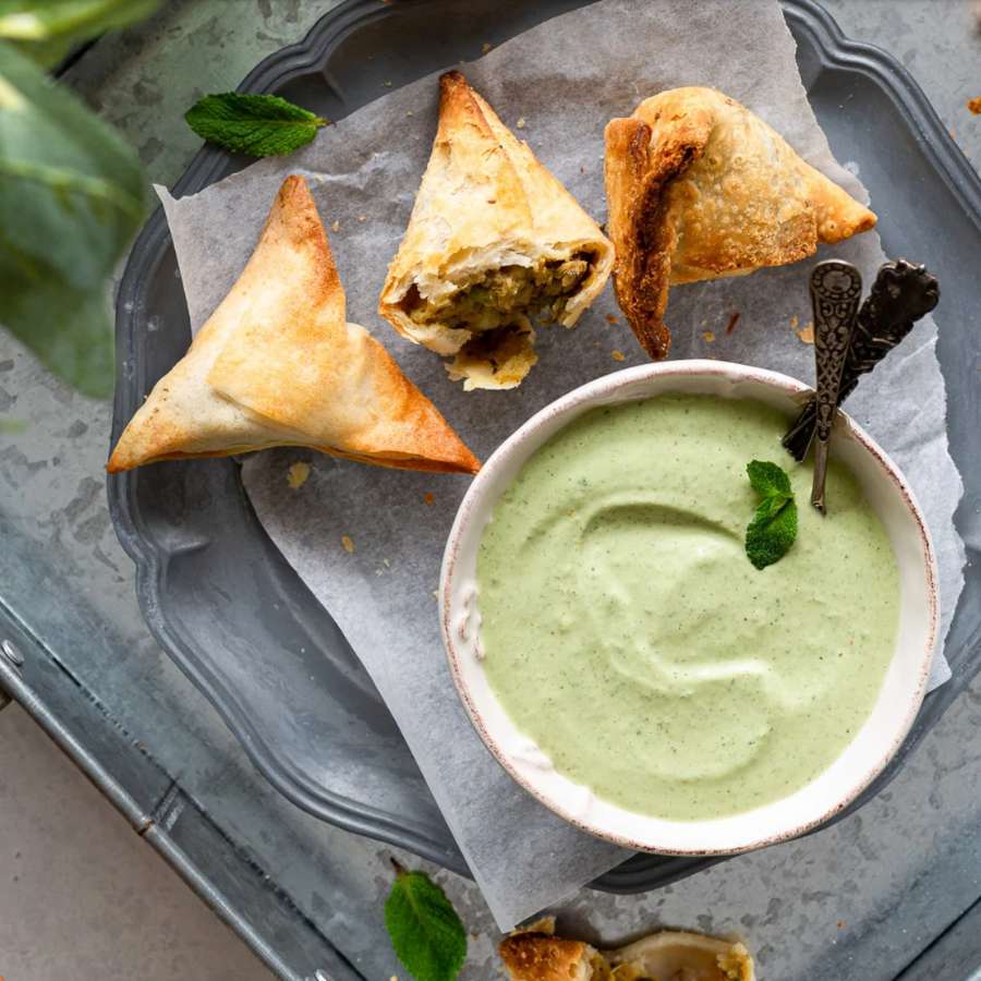 Dùng máy xay sinh tố, trộn bạc hà với dầu ăn, phô mai hạt điều và các thành phần nguyên liệu khác, trộn đều, chia vào các bát nhỏ và thưởng thức