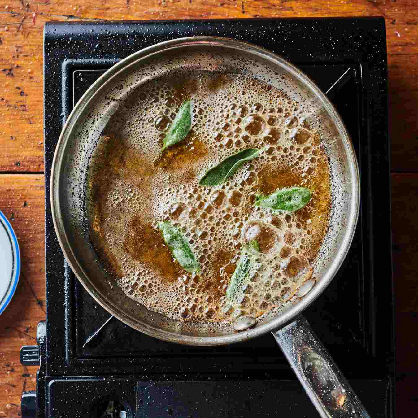 Sau khoảng 3 phút (lá sẽ bắt đầu chín giòn và sẽ ngửi thấy mùi thơm béo của bơ khi chuyển sang màu nâu). Khi lá giòn và bơ có màu vàng nâu thì tắt bếp