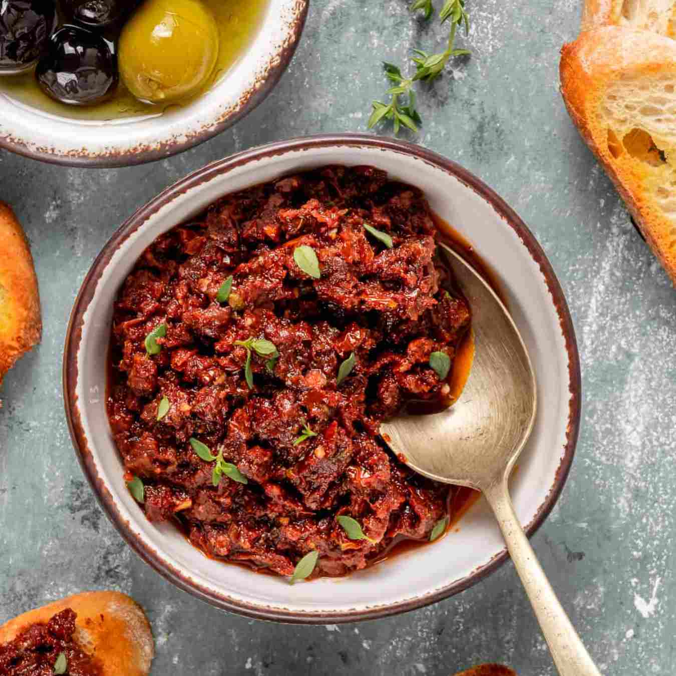 Cho cà chua khô, ớt đỏ, tỏi, các loại hạt và giấm vào máy xay thực phẩm (hoặc máy xay sinh tố) để xay nhuyễn