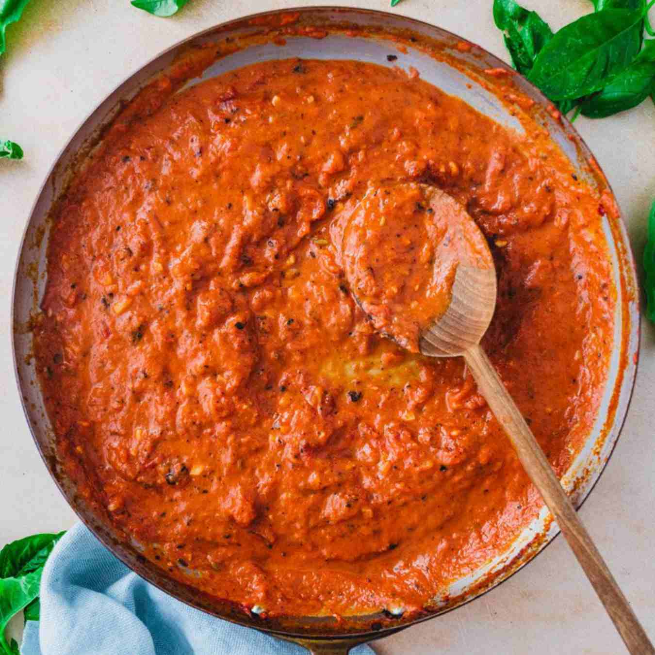 Cho cà chua, nước cốt rau và các nguyên liệu khác (trừ lá hẹ vào), đảo đều, đun nhỏ lửa và nấu trong 15 phút