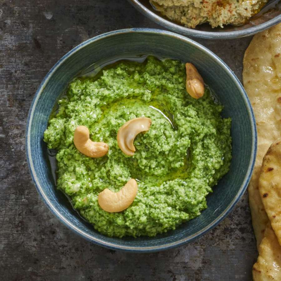 Dùng máy xay sinh tố, xay cải xoăn với hạt óc chó, dầu ăn và các thành phần nguyên liệu khác, xay nhuyễn, chia vào các bát nhỏ và dùng làm sốt chấm