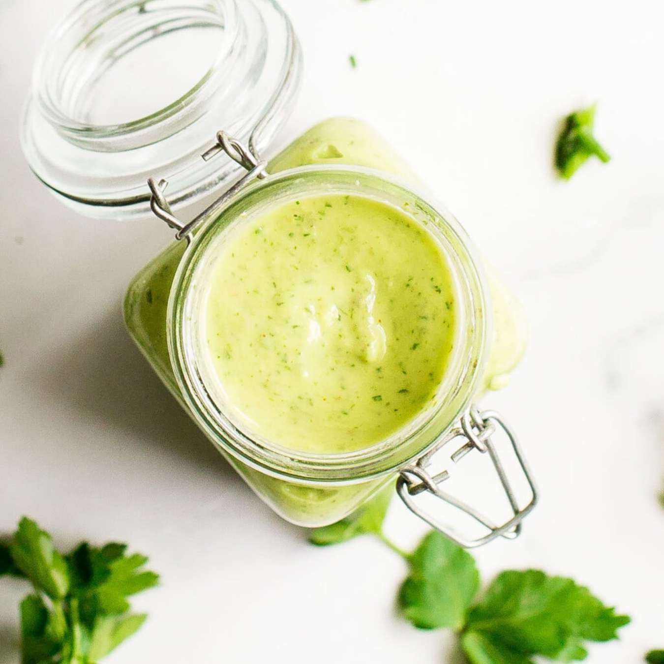 Xay 9 thành phần nguyên liệu đầu tiên trong máy xay thực phẩm cho đến khi kết hợp đều. Trong khi lưỡi dao đang hoạt động, rưới dầu ăn vào và xay cho đến khi nước sốt đặc lại và thêm các loại thảo mộc đã được thái nhỏ