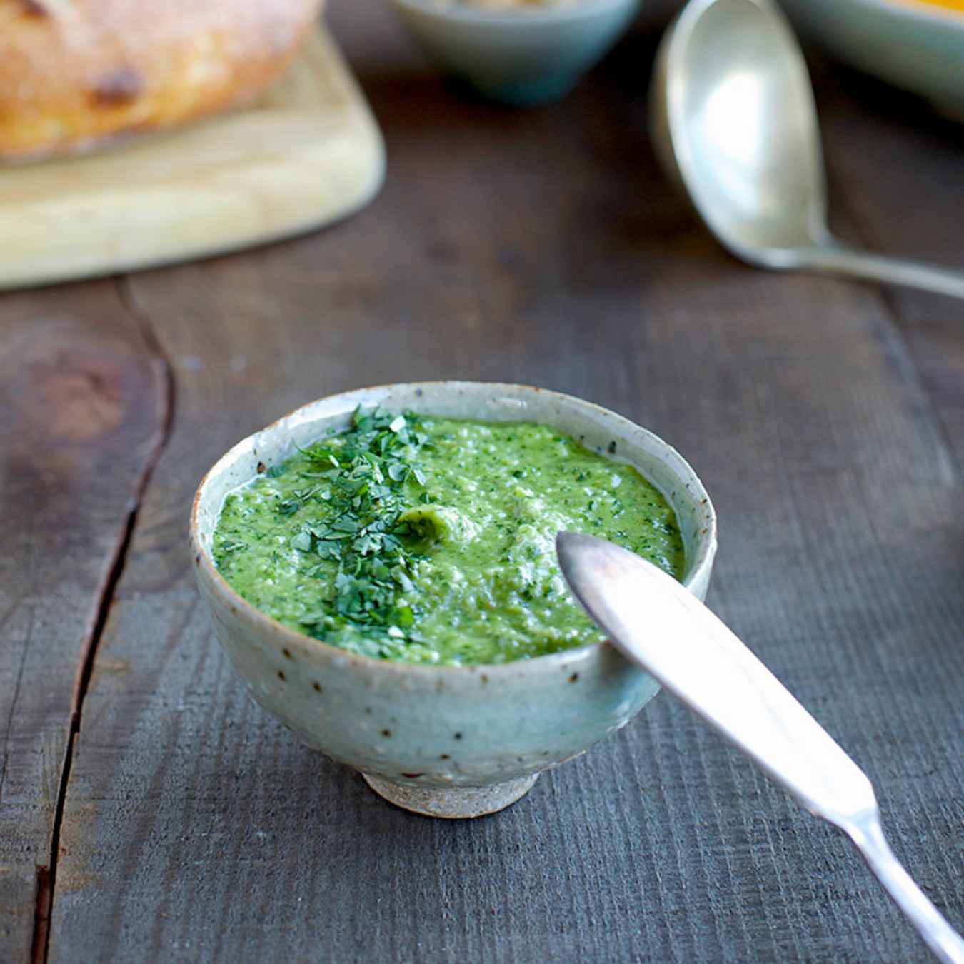 Thêm nước cốt dừa nếu cần để làm loãng. Ăn kèm với thịt thăn heo, bít tết nướng và tôm