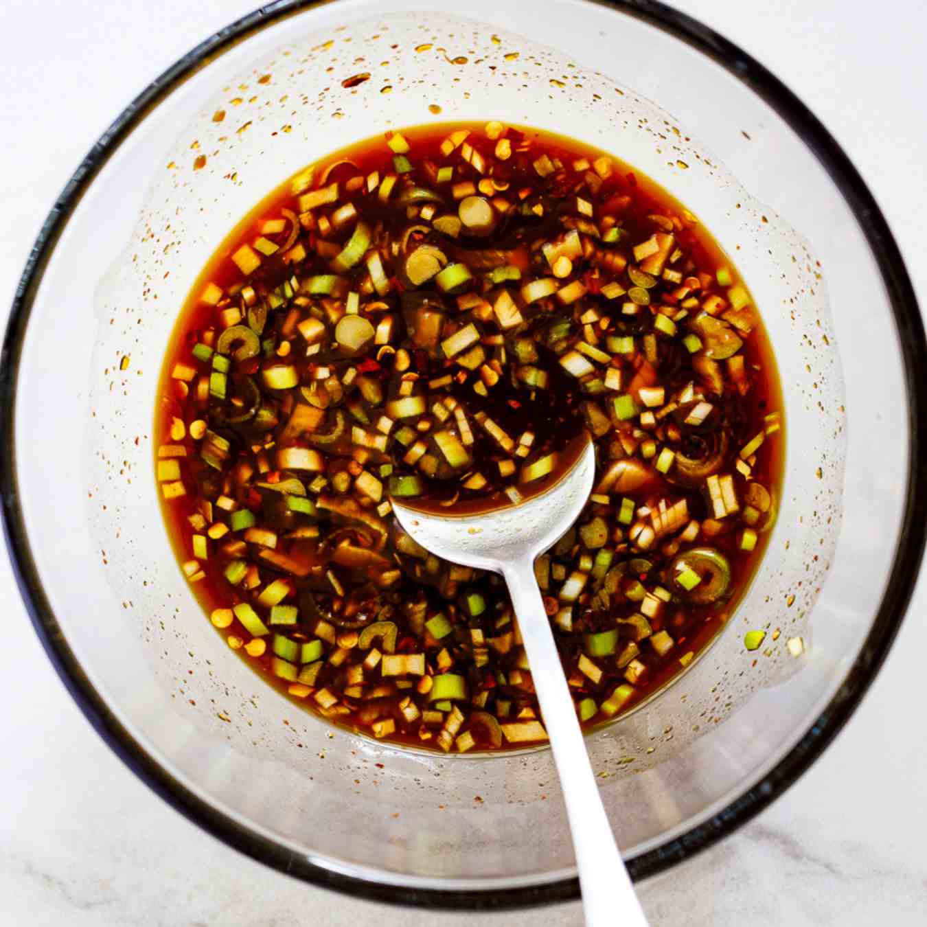 Đánh đều tất cả các nguyên liệu với nhau trong một bát nhỏ hoặc cho vào lọ hoặc hộp kín và lắc đều cho đến khi hòa quyện