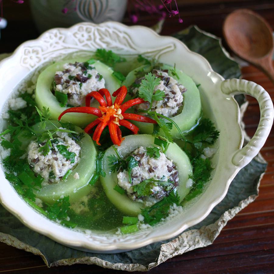 Su su gọt vỏ, moi bỏ ruột, để nguyên quả. Thịt nạc băm nhỏ cùng với hành tỏi khô, ướp nước mắm cô đặc, mì chính, hạt tiêu