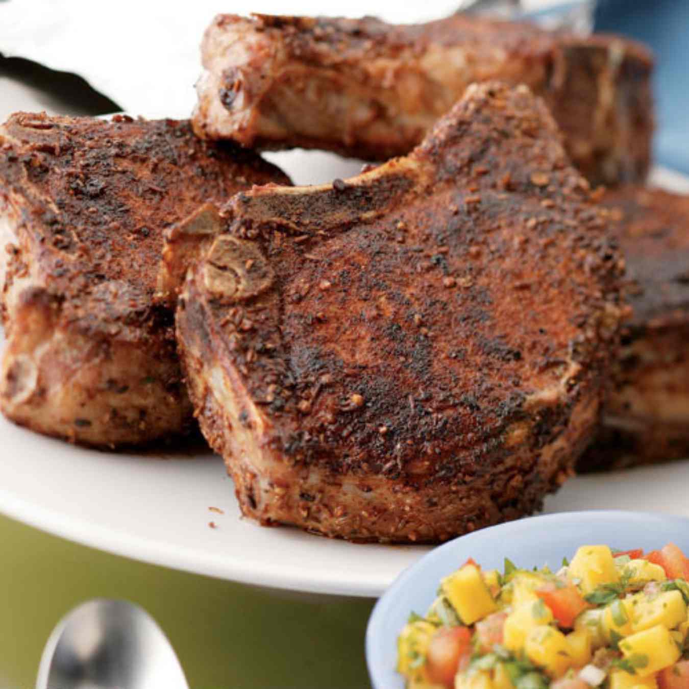 Đặt thịt heo lên chảo nướng đã làm nóng trước ở lửa vừa, rán trong 7 phút, lật và rán tiếp trong 7 phút. Chia ra đĩa và thưởng thức