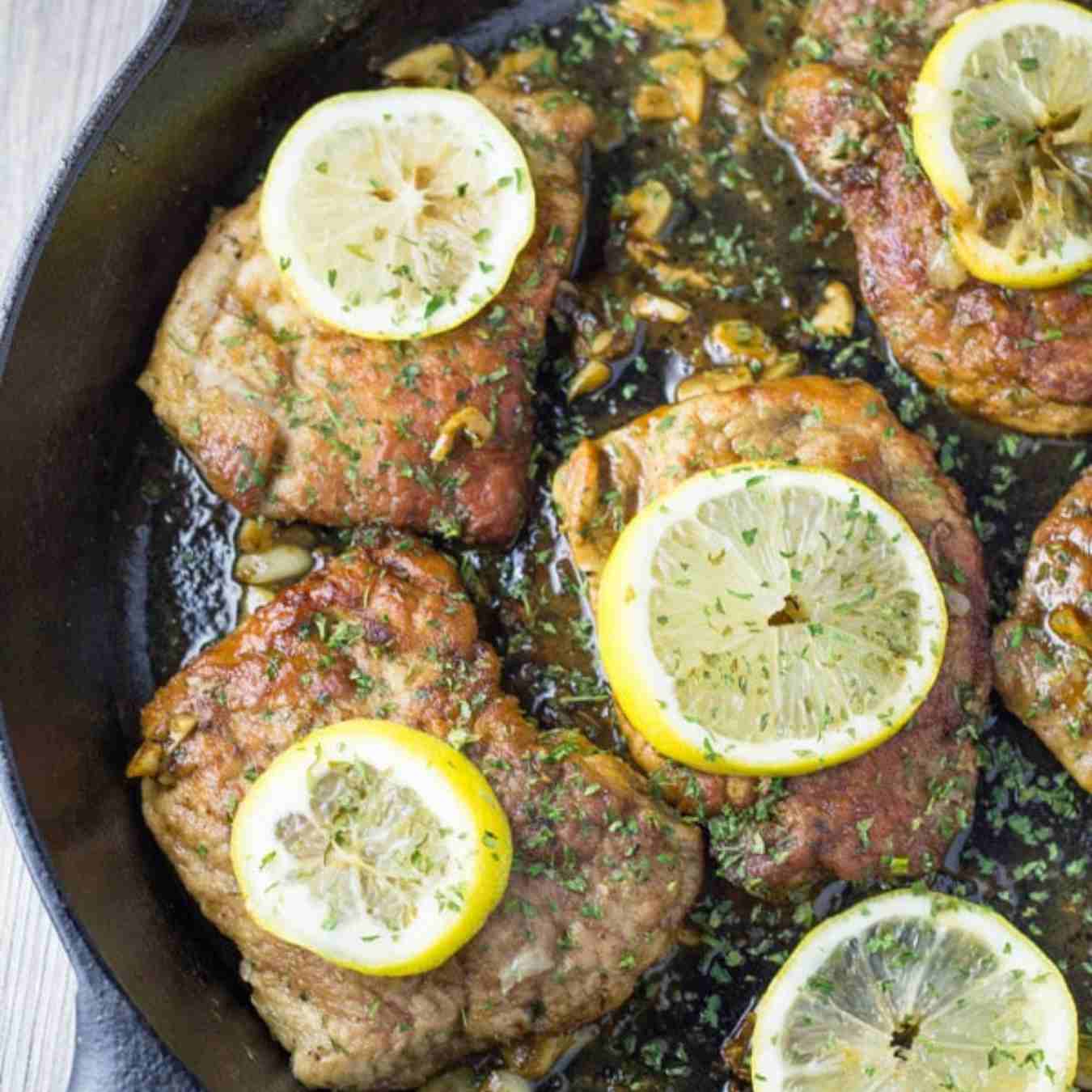Đun nóng chảo với bơ ở lửa vừa, cho sườn heo vào, nêm muối, tiêu và chanh, rán trong 6 phút, lật và rán thêm 6 phút