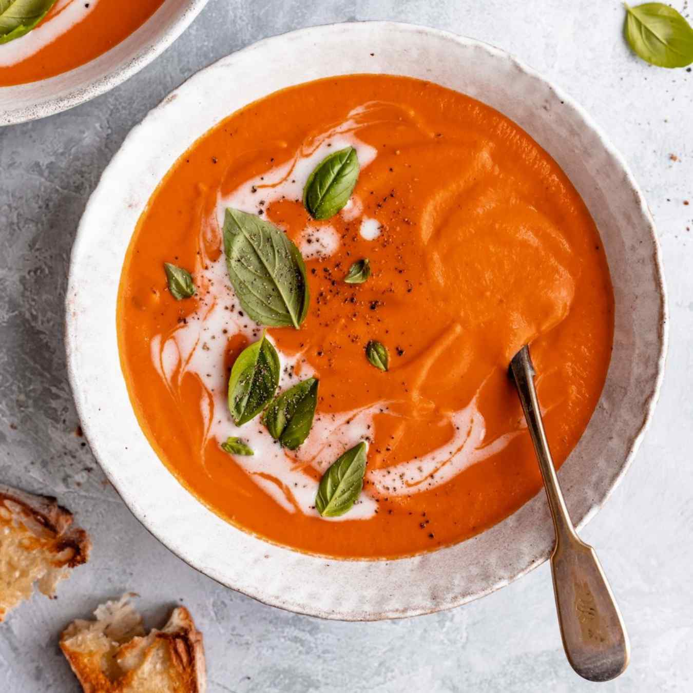Tắt lửa, chia súp ra bát, rắc lên trên cùng là thịt heo xông khói, húng quế và hành lá đã thái nhỏ