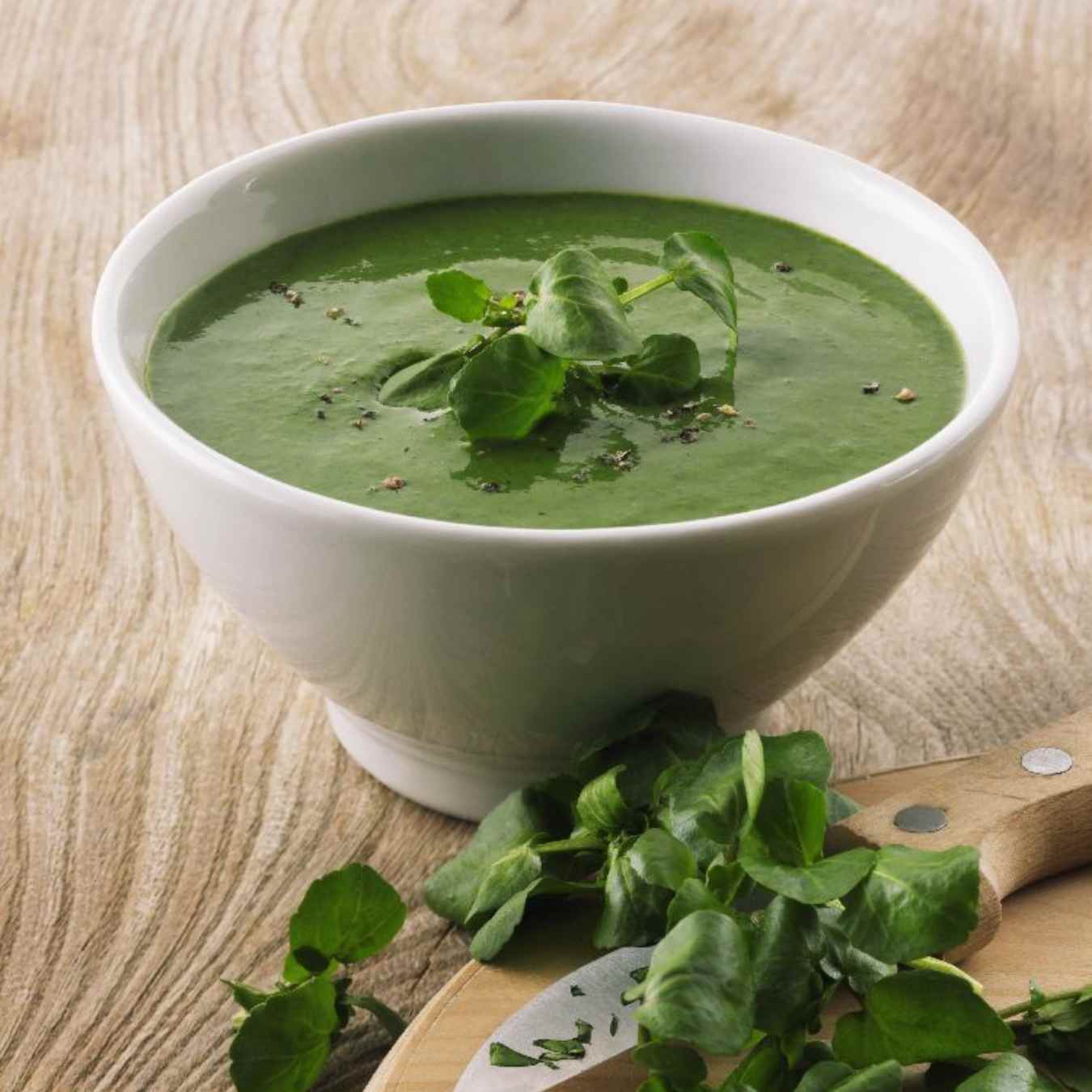 Cho hẹ tây, cải xoong, lòng trắng trứng vào khuấy đều, đun sôi, chia ra bát, rắc vừng lên trên