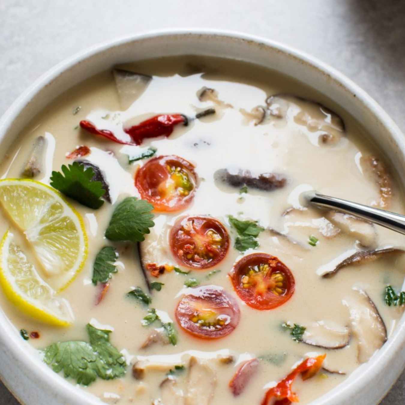 Cho dừa với kem, cà chua và các nguyên liệu khác vào nồi, đun nhỏ lửa và nấu ở lửa vừa trong 30 phút