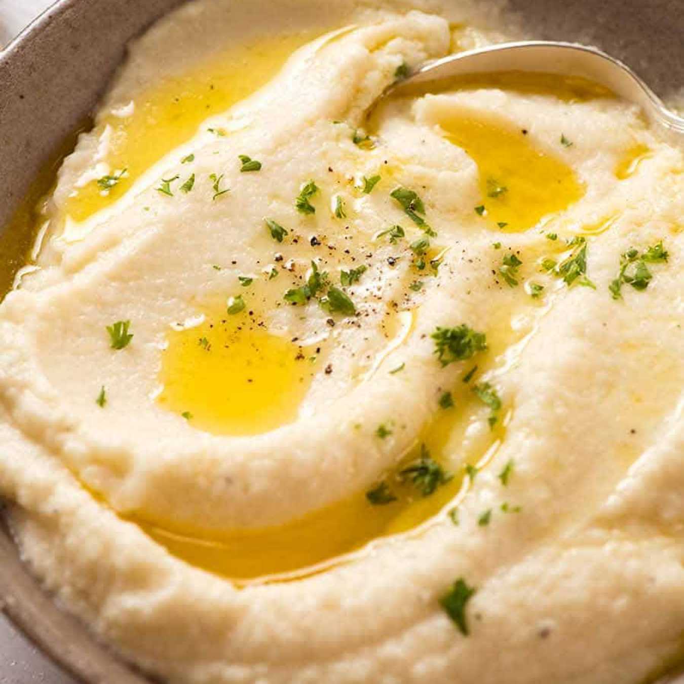 Dùng máy xay ngâm để nghiền súp lơ trắng, cùng với muối, tiêu đen và kem chua