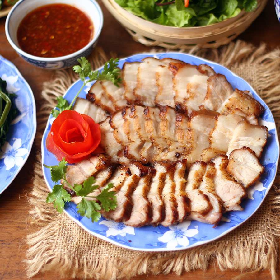 Thịt vàng đều, bì xốp trắng, thơm mùi húng lìu, hạt tiêu, vị vừa, ngọt. Miếng thịt không bị tóp nhiều, bì ăn giòn, không dai. Chúc bạn ngon miệng