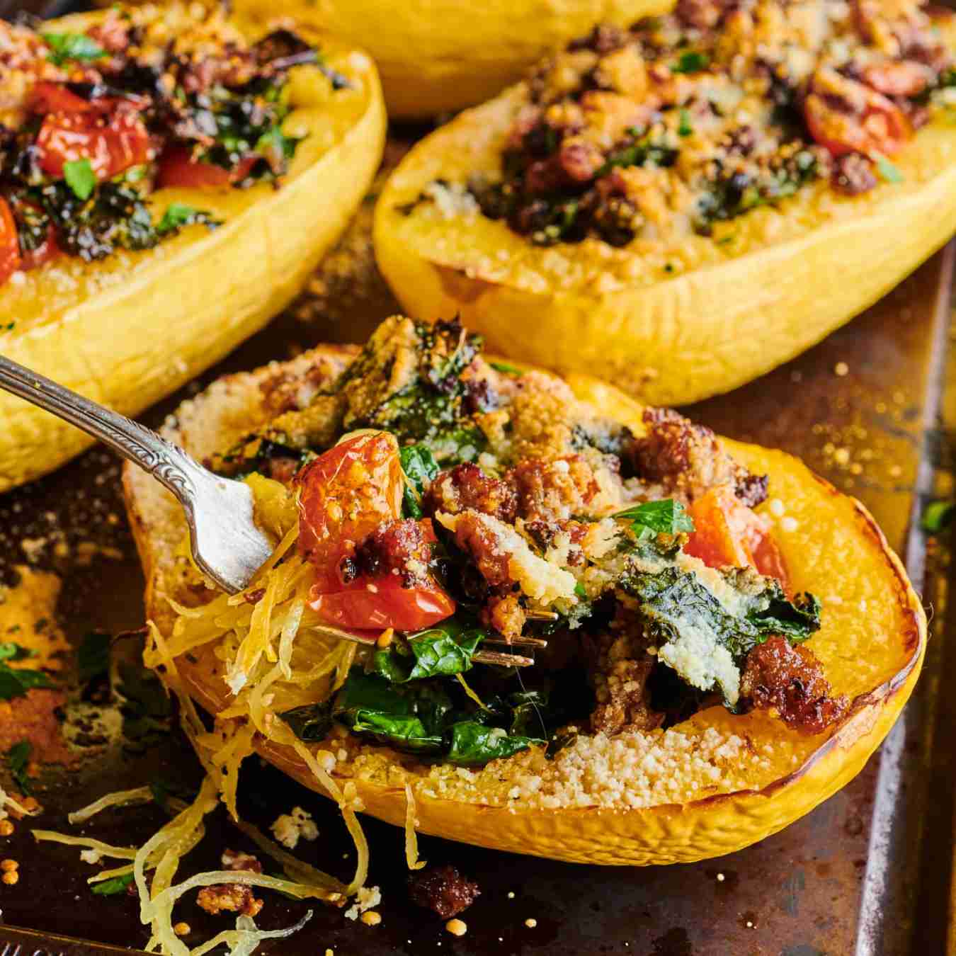 Nhồi hỗn hợp thịt bò vào hai nửa quả bí , cho vào lò nướng ở nhiệt độ 200ºC (400ºF) và nướng trong 10 phút