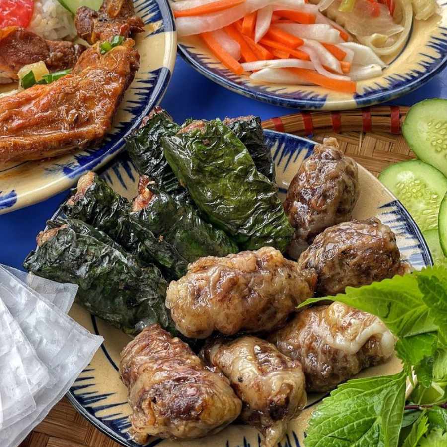 Thịt bò nướng màu vàng đều. Thơm, bén và bùi. Miếng chả bọc gọn, đều nhau, chả chín tới, không dai. Chúc bạn ngon miệng