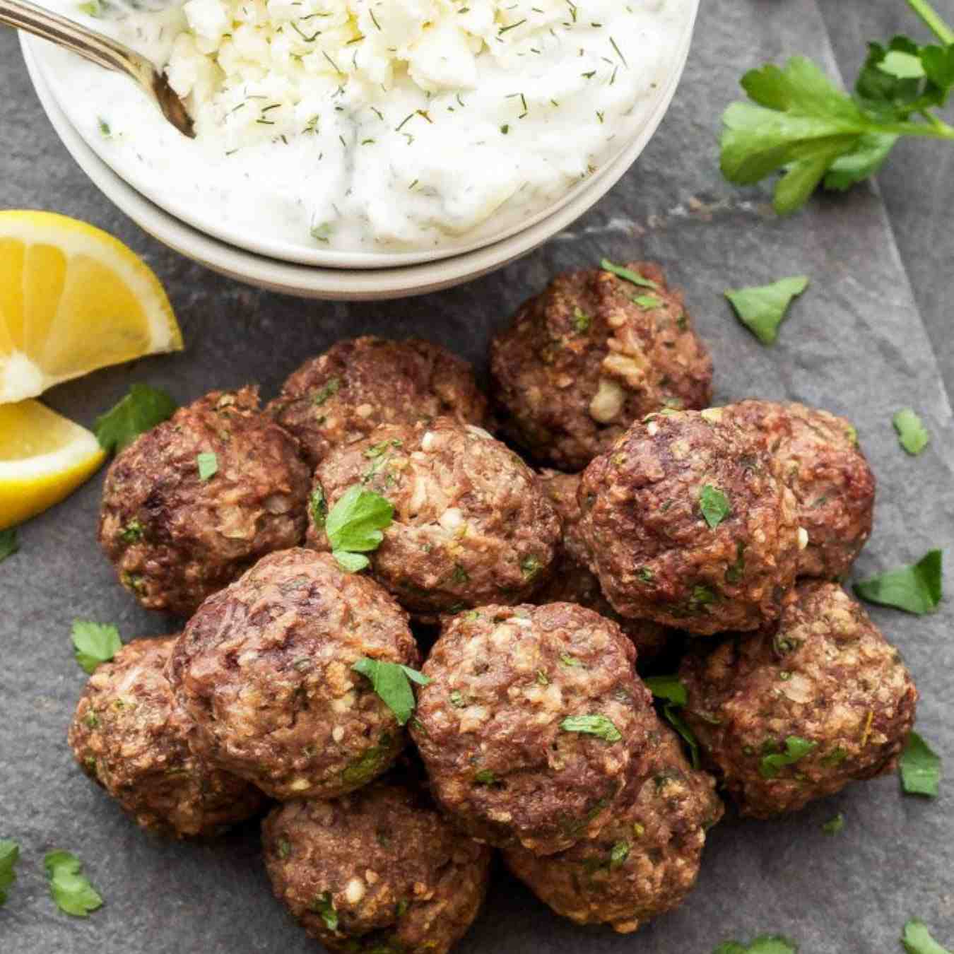 Thêm thịt viên, cùng với lượng dầu còn lại và một ít muối, tiêu và nước cốt chanh. Thêm sốt Tzatziki phủ đều lên và thưởng thức