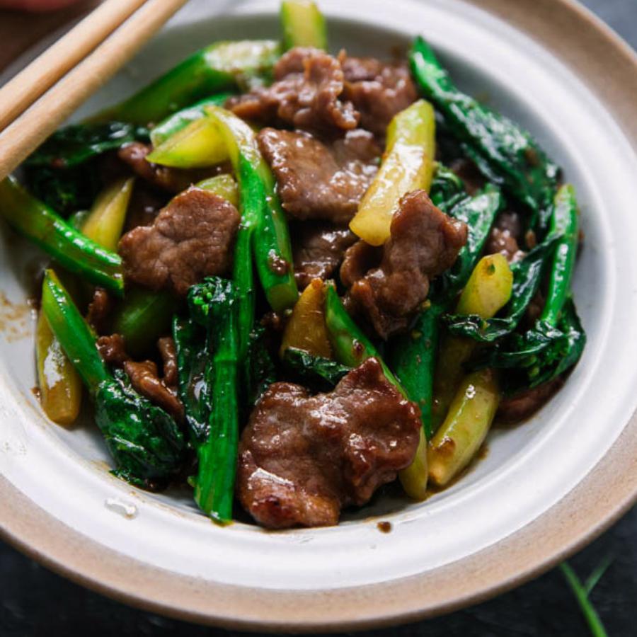 Thịt bò màu nâu, rau xanh. Mùi thơm, vị vừa ăn. Đĩa xào khô và bóng, thịt mềm, rau chín tới. Chúc bạn ngon miệng
