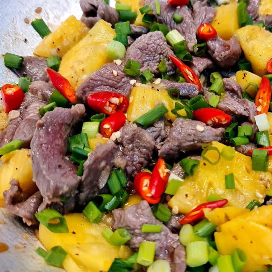 Thịt bò màu nâu, dứa vàng. Mùi thơm, vị ngọt, không chua. Đĩa xào khô, thịt thái đều, ăn mềm. Chúc bạn ngon miệng