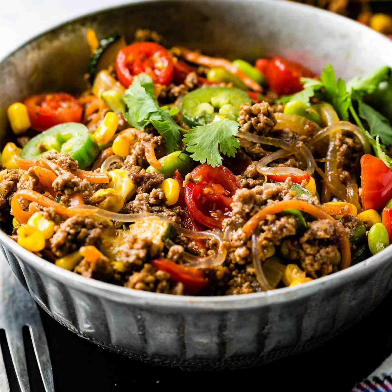 Cho nước và gia vị Taco vào khuấy đều. Giảm lửa ở mức trung bình nhỏ và nấu thêm 10 phút