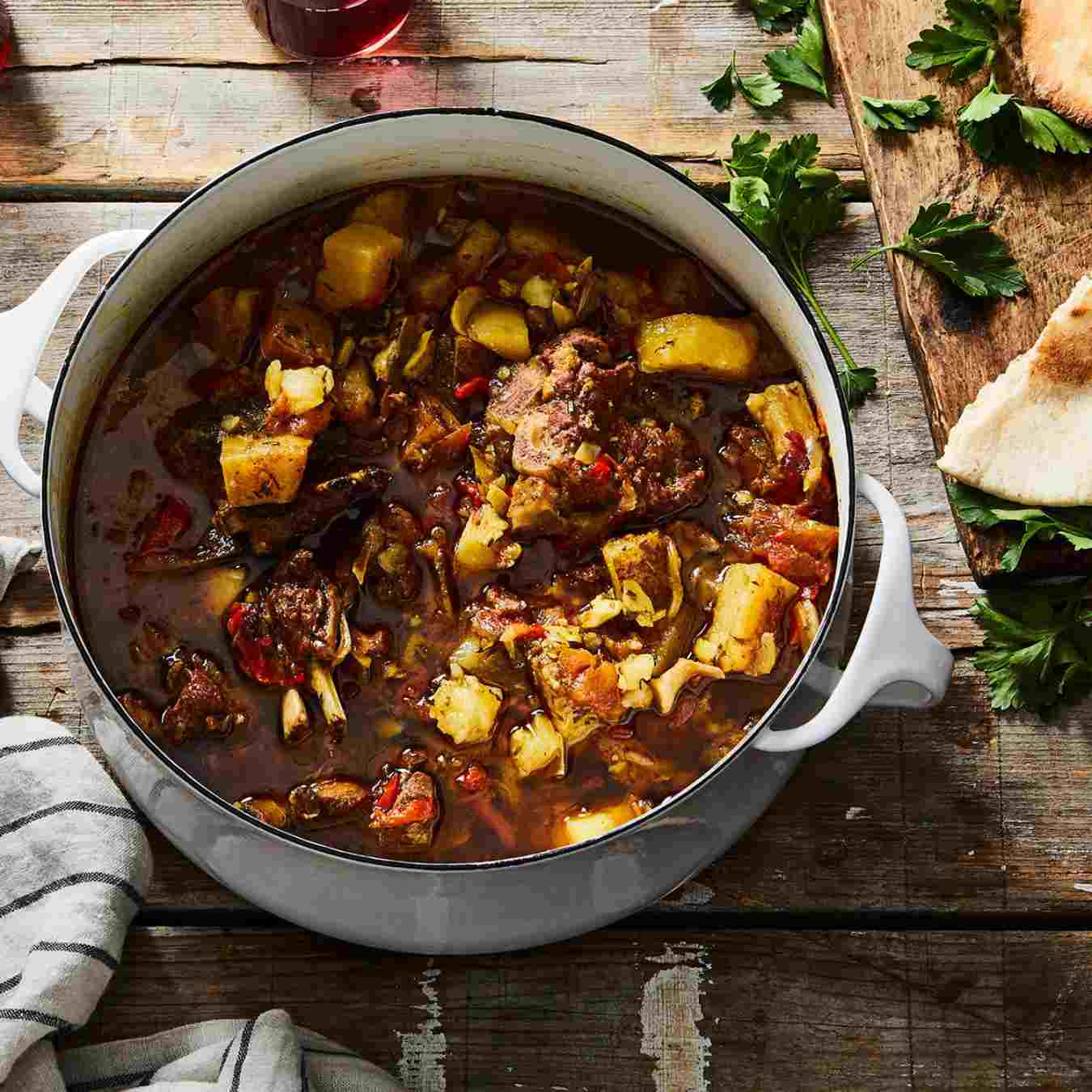 Cho thịt cừu trở lại lò nướng gang kiểu Hà Lan, khuấy đều, giảm nhiệt xuống trung bình thấp, đậy nắp và nấu trong 4 giờ