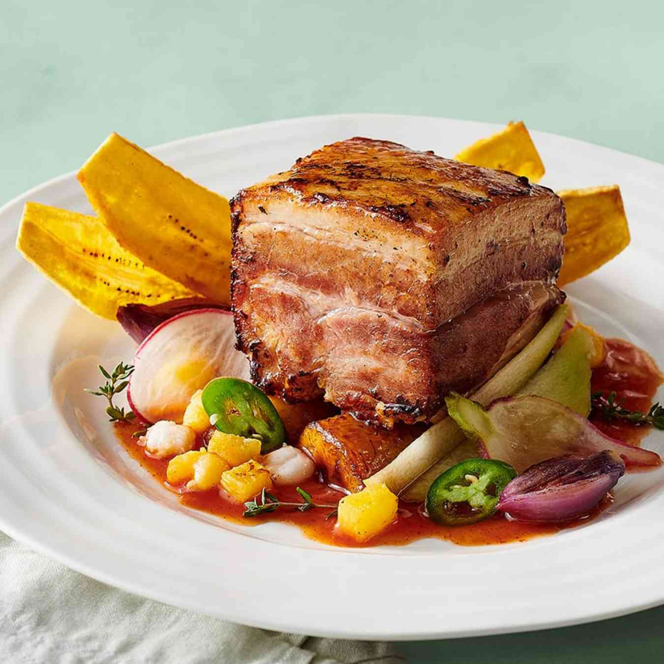 Cắt miếng thịt ba chỉ heo quay, chia ra đĩa và thưởng thức