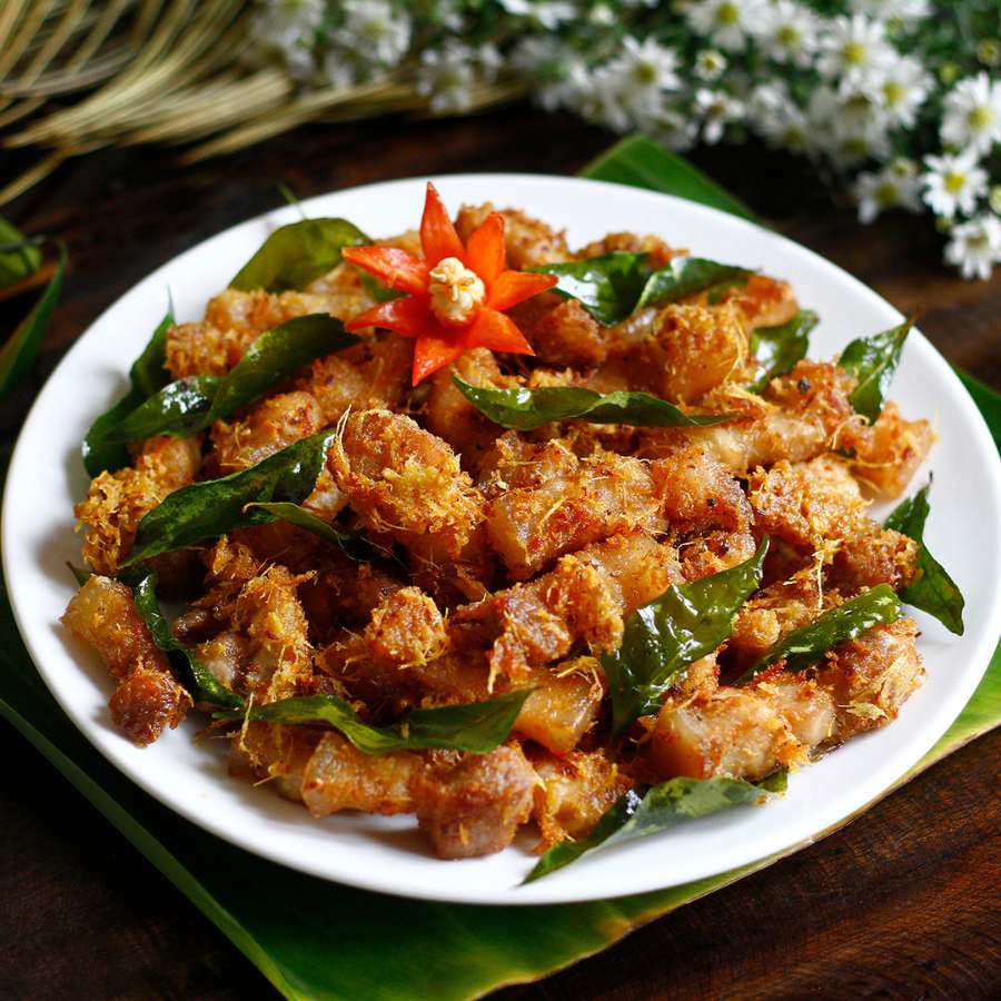 Thịt heo rửa sạch, thái miếng mỏng to bản ướp riềng, nghệ, mẻ, mắm tôm, hành, tỏi, đường ăn kiêng, nước mắm, mỡ nước để 20 phút cho ngấm