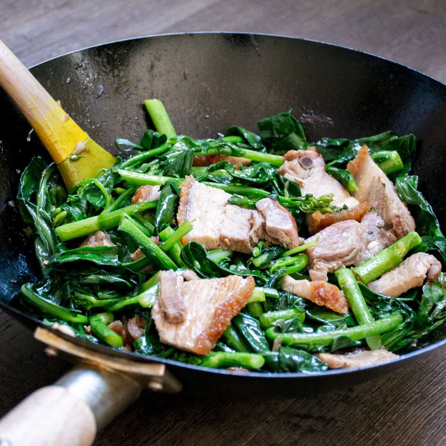 Phi thơm hành cho cuộng trắng vào xào trước rồi cho tiếp lá xanh vào đảo nhanh, đun to lửa, rau gần được cho thịt vào, xuống chút bột dừa, cho hành hoa cắt khúc, nêm mì chính rồi xúc ra đĩa, rắc hạt tiêu, rau mùi. Ăn nóng