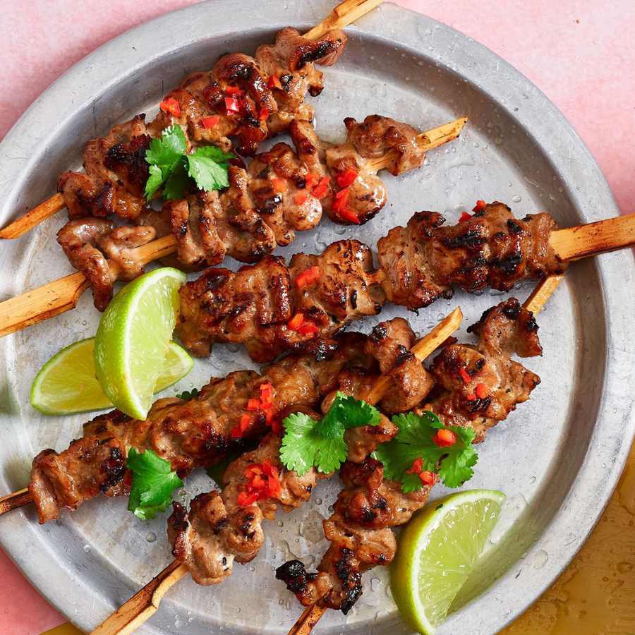 Xiên thịt vào que vót nhọn hoặc xếp vỉ đặt lên bếp than hoa, nướng chín vàng hai mặt. Ăn nóng kèm xà lách, rau thơm, dưa góp, nước mắm, giấm, ớt, tỏi, đường ăn kiêng