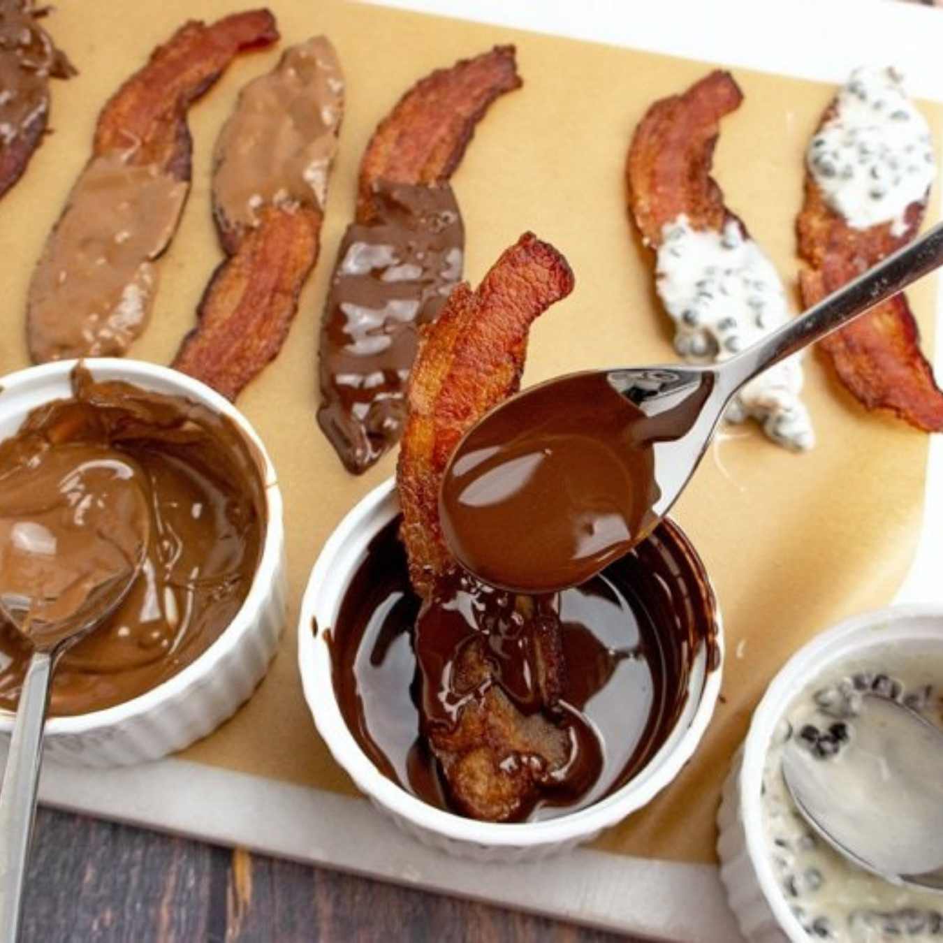 Lấy các miếng thịt heo xông khói ra khỏi lò, để nguội, nhúng từng miếng vào hỗn hợp sôcôla, đặt trên lên giấy nến, để cho nguội hoàn toàn và thưởng thức
