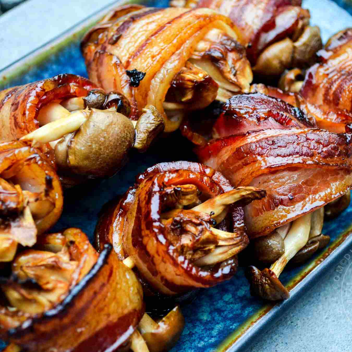 Lấy thịt xông khói xiên qua que. Cắt một mũ nấm và gấp thịt xông khói lên trên. Lặp lại cho đến khi các nguyên liệu tạo thành một xiên nấm lẫn thịt heo xông khói đầy đủ